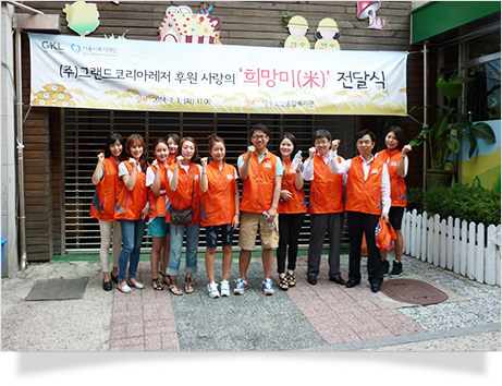 지난 7월 7일 GKL 임직원으로 구성된 봉사단은 약수노인종합복지관에서 독거어르신을 위한 ‘희망米 전달 봉사활동’을 실시했다. 이번 봉사활동은 서울시내 사각지대 어르신들의 생활안정 지원을 위해 쌀을 기부하기로 합의함에 따라 기획됐다. GKL은 독거어르신 및 조손가정을 위한 ‘사랑의 희망米’ 사업과 임직원의 자원 봉사활동 등 국내 소외계층 지원을 꾸준히 펼치고 있다.
