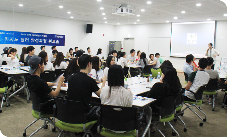 GKL에서는 2012년부터 ‘카지노 딜러 양성과정’을 통해 카지노 딜러가 되고자하는 청년들에게 꿈이 현실이 되는 기회의 장을 마련하고 있다. 이번 ‘2014 청년취업아카데미’는 6월 23일부터 시작해 8월22일 마무리된다. 교육과정 중 화합과 소통, 문제 해결력과 창의력 등의 중요성을 이해하고 자신감 강화를 위한 ‘2014 청년취업아카데미 워크숍’을 찾아가 미래의 카지노 전문가가 될 청년들의 열정과 도전정신이 얼마나 뜨거운지 느껴보았다.