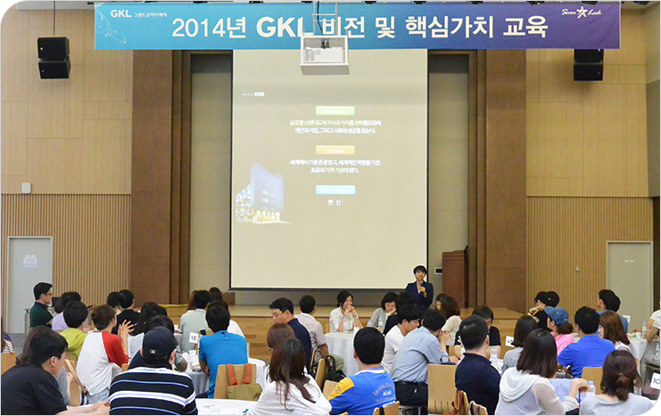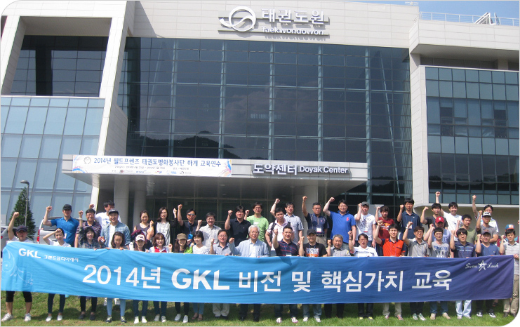 지난 6월 25~26일과 7월 2~3일 두 차례에 걸쳐, GKL에서는 워크숍 ‘2014 GKL 비전 및 핵심가치 교육’이 전라남도 무주에 위치한 태권도원에서 진행되었다. 경영본부 직원들이 참여한 이번 워크숍에서는 청와대 행정관 출신의 조미나 교수(IGM세계경영연구원)를 초청해 ‘앞으로 회사가 나아가야할 방향’과 ‘이에 대처하는 직원들의 자세’에 대한 강연이 진행되었다.