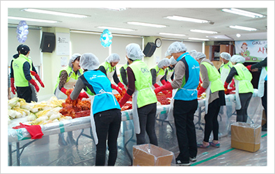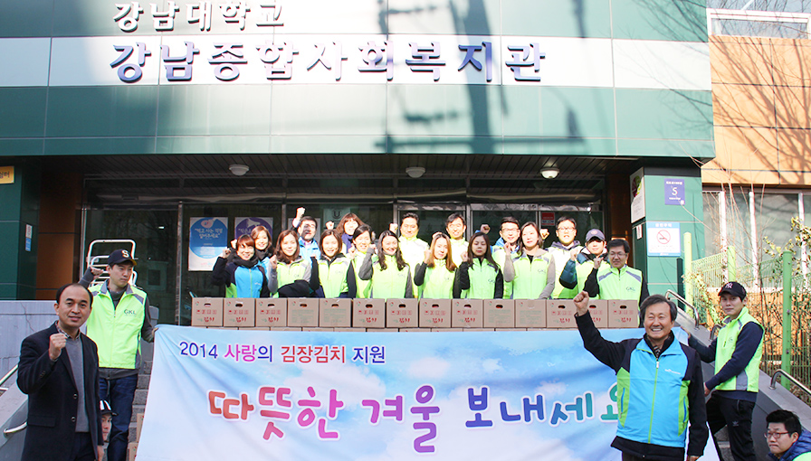 GKL과 공익법인 GKL사회공헌재단(이하 GKL재단)은 강남종합사회복지관에서 지역 내 소외 계층의 겨울나기를 돕기 위해 ‘GKL과 함께 하는 사랑의 김장김치 나눔’ 행사를 실천했다. 이번 김장김치 나눔 행사는 3번째로 진행되는 활동이었다. 행사는 GKL재단이 전체 사업비를 지원했고, GKL 임직원 30여명이 참가했다. 사랑의 김치 전달 대상은 강남구 내 저소득 독거노인, 한 부모 가정 및 조손 가정, 지역아동센터 등 총 850가구였다.
