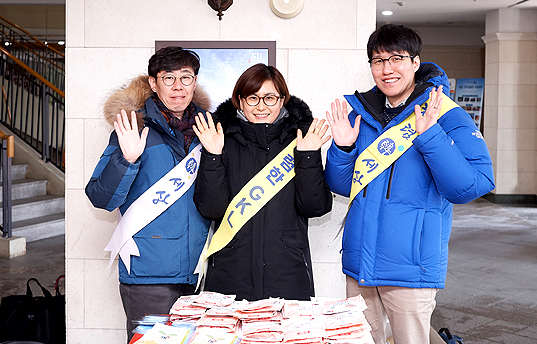 구름 한 점 없는 화창한 날씨지만 역시 스키장에 부는 산바람은 무시하지 못합니다. 그래서 이날은 감사실에서 임직원 가족들이 보다 즐거운 시간을 보낼 수 있도록 핫팩을 준비해 나누어주었습니다. 이번 캠페인은 인권법무팀, 윤리경영팀, 반부패청렴팀이 함께 준비했는데요. ‘오늘 그대를 따뜻하게 해드리리라’라고 쓰인 핫팩을 하나 둘 나누어주며 ‘갑질 없는 GKL 청렴캠페인’도 함께 진행되었습니다.