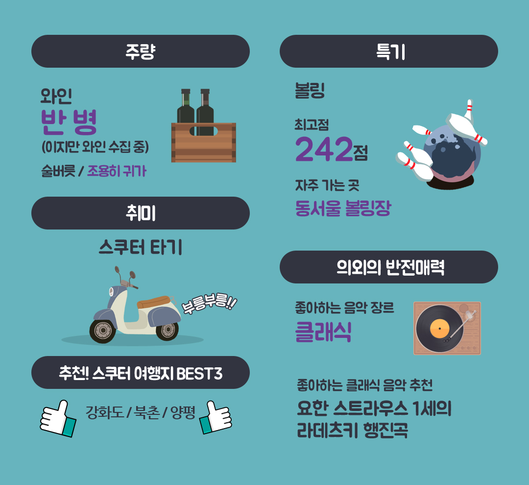 인터뷰를 진행해보니 오규봉 대리는 목표가 정말 많은 열정적인 사람이었습니다. 스쿠터로 더 많은 곳은 여행하길 원하고, 볼링 최고점도 높이고 싶고, 주량은 반병밖에 안되지만(?) 와인은 더 수집하고 싶다고 하네요.