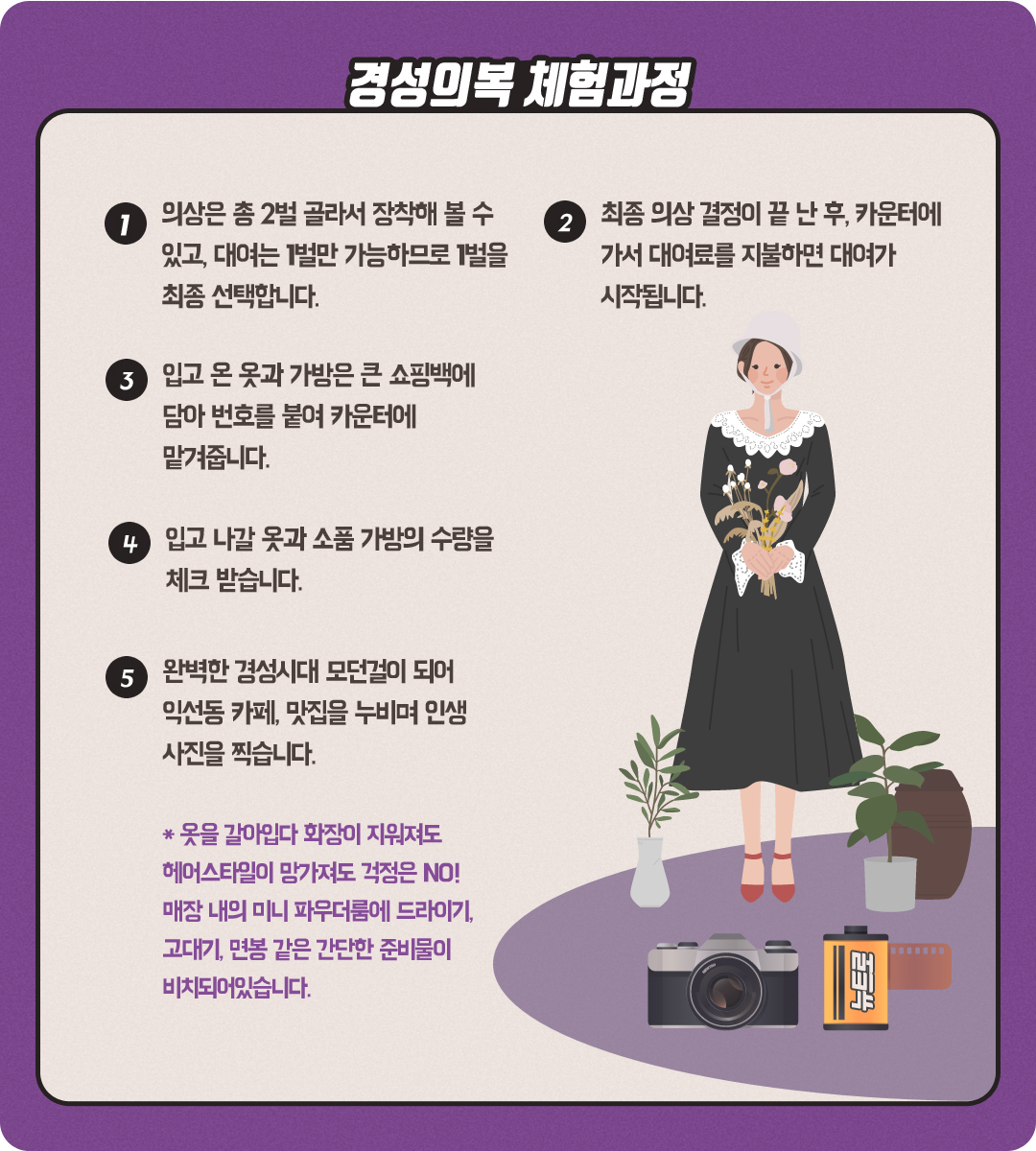 이곳은 개화기 시대의 의상과 소품을 제공하여 그 시절의 분위기를 직접 체험할 수 있는 의상대여점입니다. 자체적인 포토존도 준비되어 있어 제대로 분위기를 내서 사진을 찍을 수도 있습니다. 또한, 익선동에 위치하고 있어 의상을 입고 익선동 곳곳을 돌아다니면서 고즈넉한 분위기를 느낄 수 있어, 사랑하는 연인과 친구들과 함께 특별한 추억을 남기기 좋은 곳입니다.