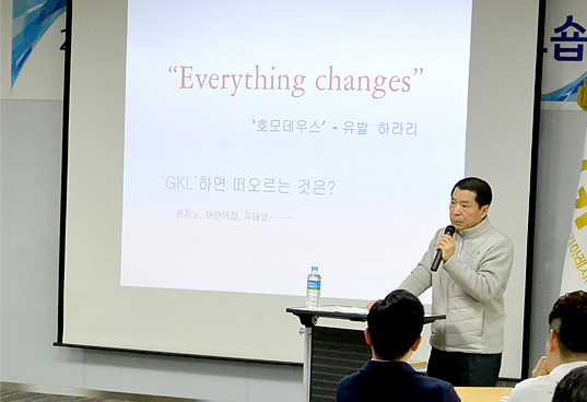 어느새 개나리가 지천에 피어 봄을 실감했던 지난 3월 19일, GKL 아카데미 대교육장에는 26명 혁신리더가 GKL의 혁신을 위해 한자리에 모였습니다. 이날 오전, 혁신리더 워크숍은 혁신경영본부장님의 멋진 강의로 시작되었는데요. “역사에 존재하는 단 하나의 위대한 상수는 모든 것이 변한다는 사실이다”라는 말씀을 시작으로, 문화와 창의성, 전통과 창조, GKL 혁신과제, 호모사피엔스가 지구의 주인이 되게 한 힘인 유연한 협력관계를 강조하는 등 풍성한 이야기로 멋진 강의가 펼쳐졌습니다. 오후에는 유태열 사장님께서 직접 방문하셔서 혁신리더들에게 격려의 말씀도 해주셨습니다.